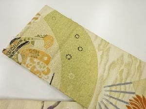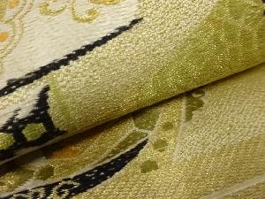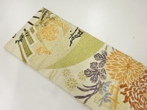 JAPANESE KIMONO / ANTIQUE NAGOYA OBI / SILK / WOVEN FOLDING FAN & TREASURE BOAT & PINE & KIKU