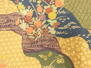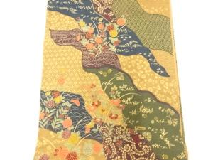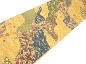 手織り紬道長取りに花古典柄全通袋帯
