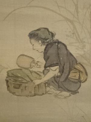望月玉川筆 月下秋砧図 肉筆紙本掛軸(箱付)