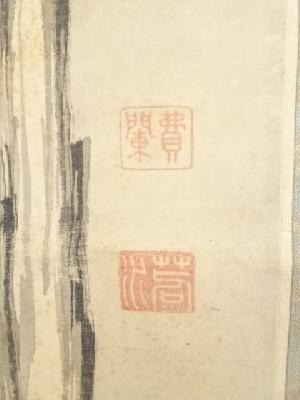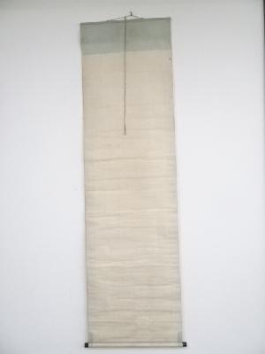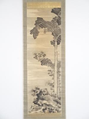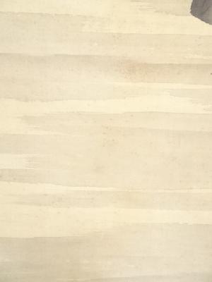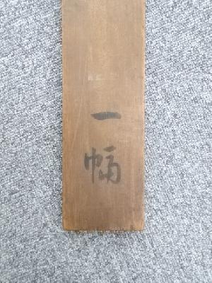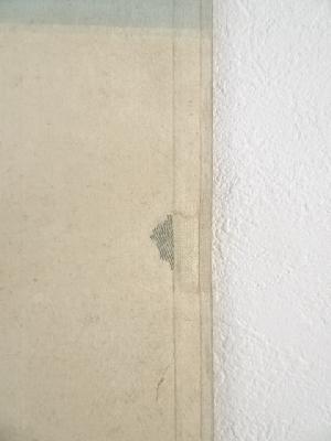 表具、本紙にシミがあり、表具表の一部に虫食い、表具裏の端に虫食いや剥がれがあります。