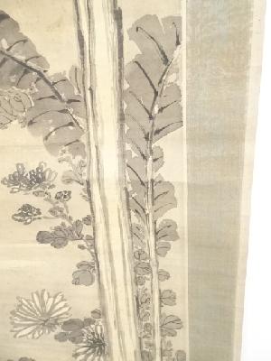 中国画 清朝期 芭蕉菊図 肉筆絹本掛軸(長谷川嵐渓・富取芳斎・巻梧石箱書)(共箱)