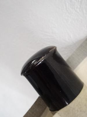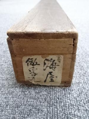 八双端に破れがあり、軸先に漆剥げ、軸棒に書き込みがあります。