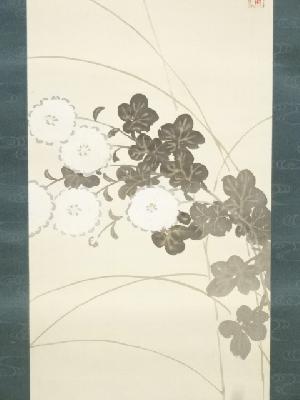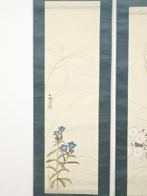 野田九浦筆 菊・桔梗図双幅 肉筆絹本掛軸(保護箱)