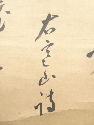 表具裏に書き込みがあり、軸先の片方に割れと汚れがあります。