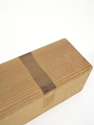 木箱は保護箱です。木箱に張り紙とテープ跡があります。