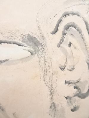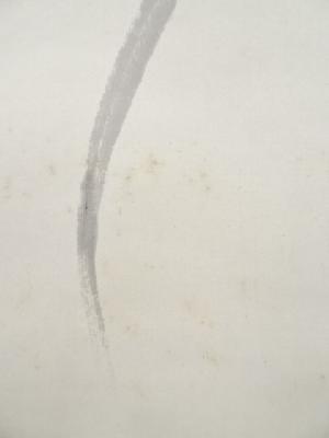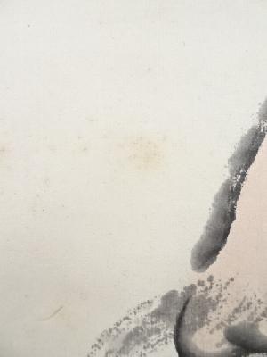 本紙全体に薄くシミがあり、表具裏にシミ、汚れがあります。