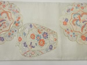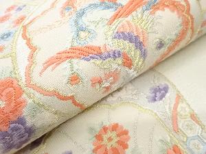 絵皿に壷・鳳凰・草花・蝶模様織出し袋帯