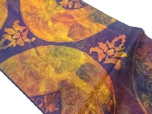 半円に狩猟人物・動物・草花模様織出し開き名古屋帯(額縁仕立て)