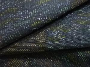 洗練された落ち着きのある色合いで、生地そのものは柔らかく、しわになりにくいと言われている。大島紬の特徴とも言える、織締めと呼ばれる技法で藍を用いて染められた糸を使用している。