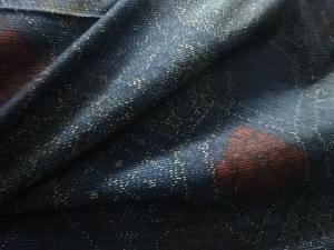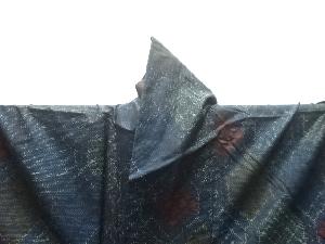 洗練された落ち着きのある色合いで、生地そのものは柔らかく、しわになりにくいと言われている。大島紬の特徴とも言える、織締めと呼ばれる技法で藍を用いて染められた糸を使用している。