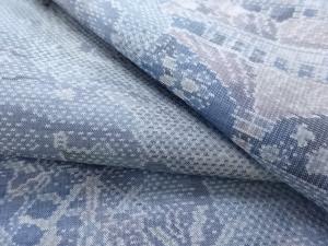 洗練された落ち着きのある色合いで、生地そのものは柔らかく、しわになりにくいと言われている。大島紬の特徴とも言える、織締めと呼ばれる技法で藍を用いて染められた糸を使用している。