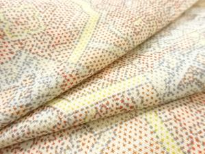 洗練された落ち着きのある色合いで、生地そのものは柔らかく、しわになりにくいと言われている。大島紬の特徴とも言える、織締めと呼ばれる技法で藍を用いて染められた糸を使用している。