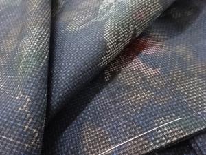 洗練された落ち着きのある色合いで、生地そのものは柔らかく、しわになりにくいと言われている。大島紬の特徴とも言える、織締めと呼ばれる技法で藍を用いて染められた糸を使用している。