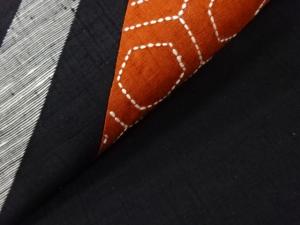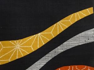 手織り紬切り嵌め風刺し子曲線に麻の葉・亀甲模様刺繍名古屋帯