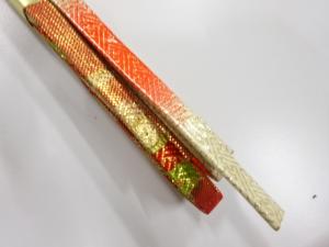 金、銀、漆を貼った特製の和紙を細く裁断したものを経糸とし、絹の撚糸を染色したものを緯糸として織り上げたもので、網代(あじろ)、紗綾(さや)型、菱等などの多様な模様を持つ。