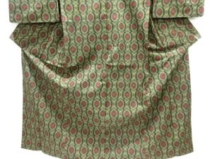 洗練された落ち着きのある色合いで、生地そのものは柔らかく、しわになりにくいと言われている。大島紬の特徴とも言える、織締めと呼ばれる技法で藍を用いて染められた糸を使用している。