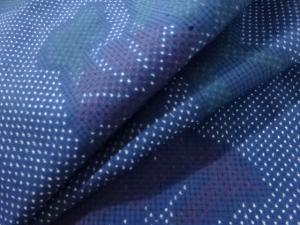 洗練された落ち着きのある色合いで、生地そのものは柔らかく、しわになりにくいと言われている。大島紬の特徴とも言える、織締めと呼ばれる技法で藍を用いて染められた糸を使用している。