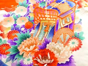 アンティーク 御所車に花模様刺繍着物