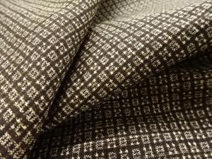洗練された落ち着きのある色合いで、生地そのものは柔らかく、しわになりにくいと言われている。大島紬の特徴とも言える、織締めと呼ばれる技法で藍を用いて染められた糸を使用している。