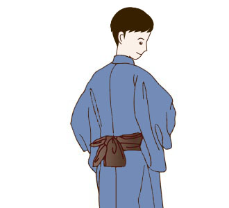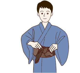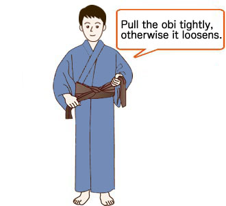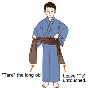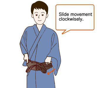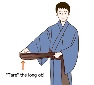 | 1. Place the center of the Heko obi on the abdomin. | 2. Wrap "Tare" for three times. |
