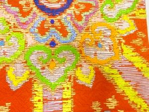 This piece is a reproduction of the "Shokko Nishiki" which is supported to have been made in Chona in the 14th Century and handed down as a "Meibutsu-gire(a celebrated textile fabric) at the House of Maeda, a great feudal lord in the Edo period (1600-1868). It is executed as a warp-patterned brocade with a sophisticated color scheme.