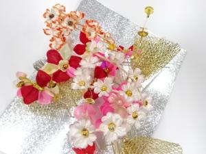 Tsumami-zaiku or Tsumami is a traditional Japanese craft made from small, square-cut pieces of cloth (usually Chirimen) that is pinched and folded with tweezers. It originated about 200 years ago during the Edo period.