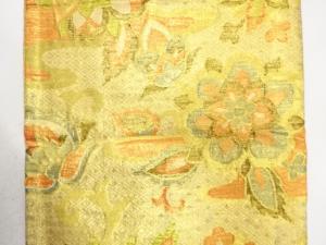Japanese paper coated in gold, silver or lacquer is used as the warp and the weft is dyed silk threads. Saga Nishiki has various woven patterns such as Ajiro(wickerwork-like pattern) and Saya(gossamer-figured pattern). It takes times to produce Saga Nishiki so only several inches are produced each day.