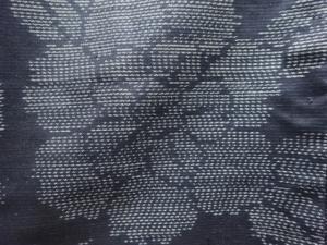 洗練された落ち着きのある色合いで、生地そのものは柔らかく、しわになりにくいと言われている。大島紬の特徴とも言える、織締めと呼ばれる技法で藍を用いて染められた糸を使用している。