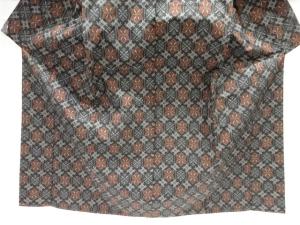 洗練された落ち着きのある色合いで、生地そのものは柔らかく、しわになりにくいと言われている。大島紬の特徴とも言える、織締めと呼ばれる技法で藍を用いて染められた糸を使用している。