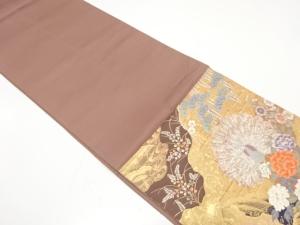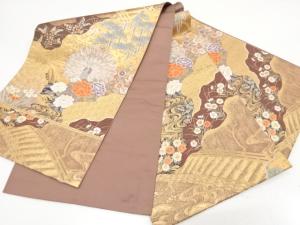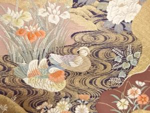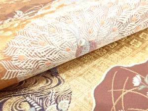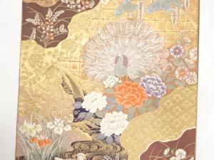 橋に孔雀・鴛鴦・草花模様織り出し 袋帯