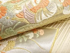 扇に鴛鴦・鶴・草花模様織り出し 袋帯
