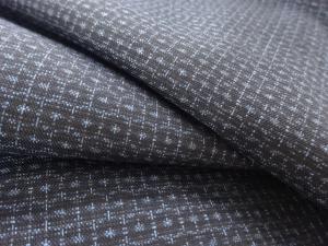 洗練された落ち着きのある色合いで、生地そのものは柔らかく、しわになりにくいと言われている。大島紬の特徴とも言える、織締めと呼ばれる技法で藍を用いて染められた糸を使用している。