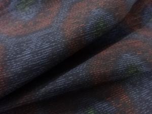 洗練された落ち着きのある色合いで、生地そのものは柔らかく、しわになりにくいと言われている。大島紬の特徴とも言える、織締めと呼ばれる技法で藍を用いて染められた糸を使用している。