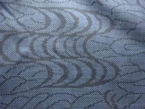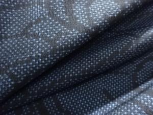 洗練された落ち着きのある色合いで、生地そのものは柔らかく、しわになりにくいと言われている。大島紬の特徴とも言える、織締めと呼ばれる技法で藍を用いて染められた糸を使用している。