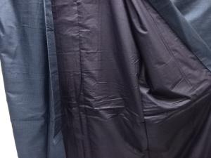 洗練された落ち着きのある色合いで、生地そのものは柔らかく、しわになりにくいと言われている。大島紬の特徴とも言える、織締めと呼ばれる技法で藍を用いて染められた糸を使用している。