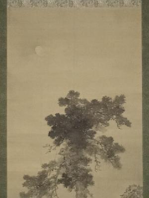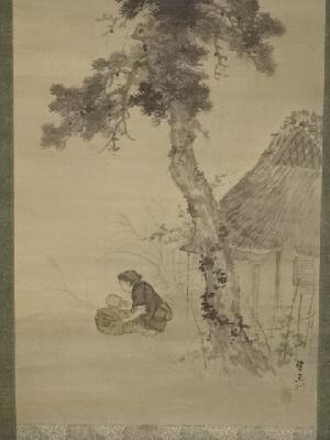 望月玉川筆 月下秋砧図 肉筆紙本掛軸(箱付)