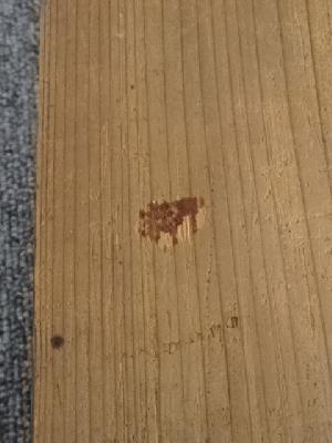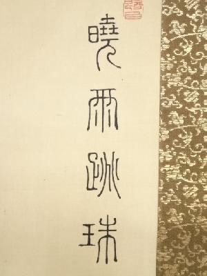 軸先にテープ跡、汚れがあり、表具裏上部に劣化があります。