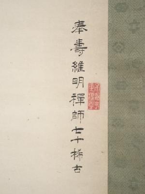 原在中筆 寿老人図(維明周奎宛為書有) 肉筆紙本掛軸(保護箱)