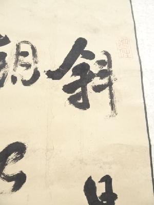 八双付近の破れを補修した跡があります。 表具裏に2点テープによる補修があります。 軸先に剥げがあり、木箱にシミがあります。 その他に問題はなく、まだまだ使用可能な状態です。 ※検索一覧と詳細ページにおいて、色の見え方が異なることがございます。 お進み頂いた詳細ページの商品の色が、より実物に近い色でございます。予めご理解ください。