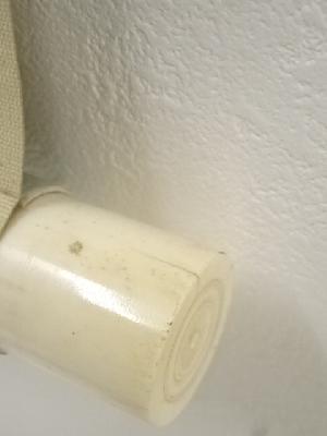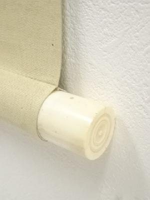 表具の一部に虫食い穴があり、軸棒周辺に汚れ、軸先にヒビがあります。