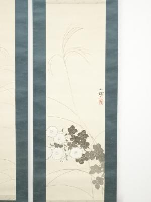 野田九浦筆 菊・桔梗図双幅 肉筆絹本掛軸(保護箱)