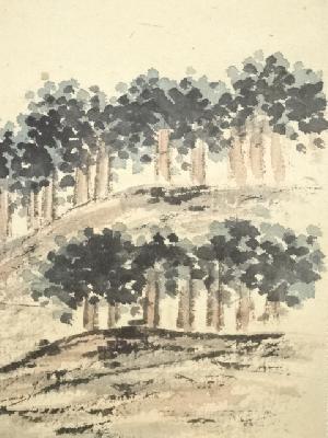 甲斐虎山筆 嶺頭古廟図 肉筆紙本掛軸(共箱)