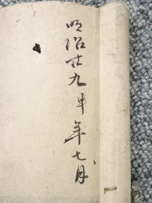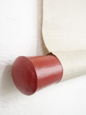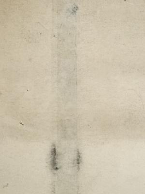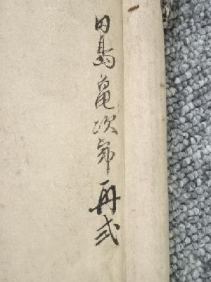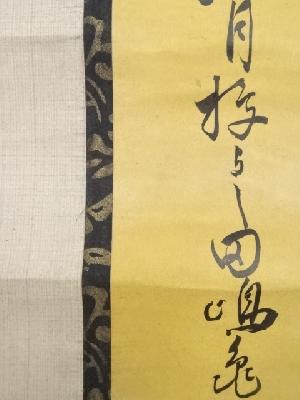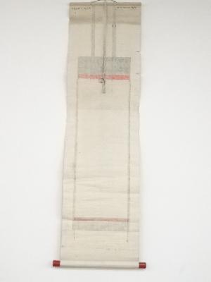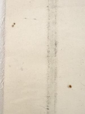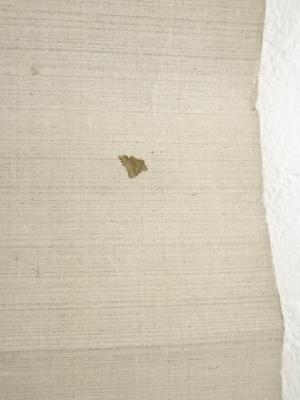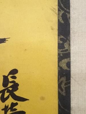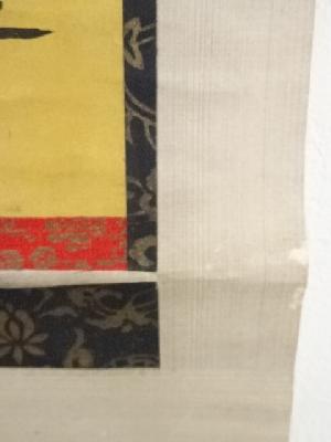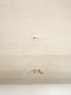 巻き跡による折れ、表具端の虫食い、表具裏の汚れなど、経年による汚れがあります。