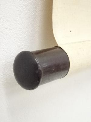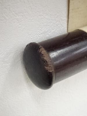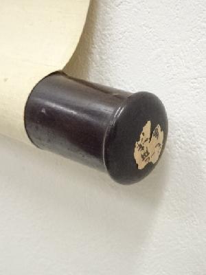 軸先の片方にシールが貼られており、もう片方に欠けがあります。