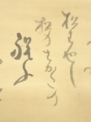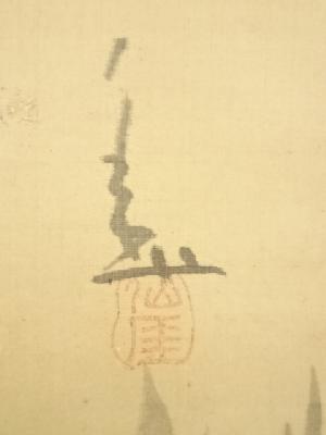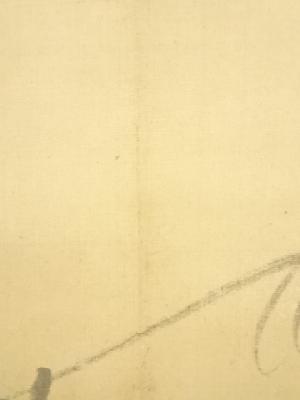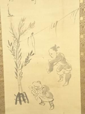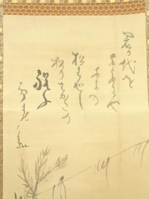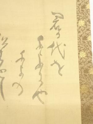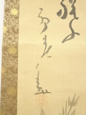 本紙に薄汚れ、シミがあり、表具裏上部にシミがあります。