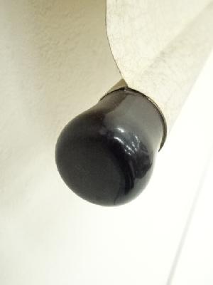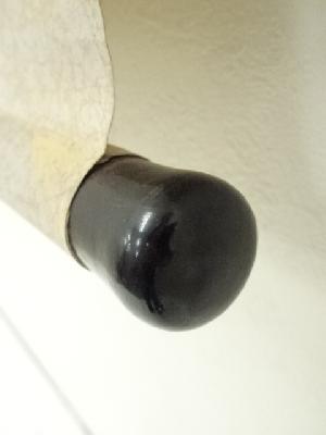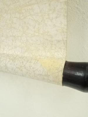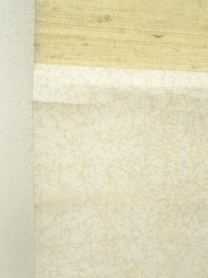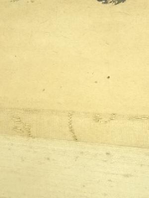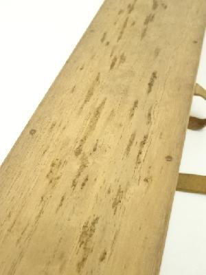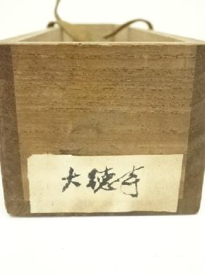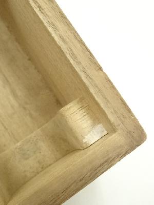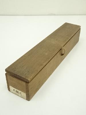 木箱の身に張り紙・底に汚れがあり、内側に小さなシール跡があります。