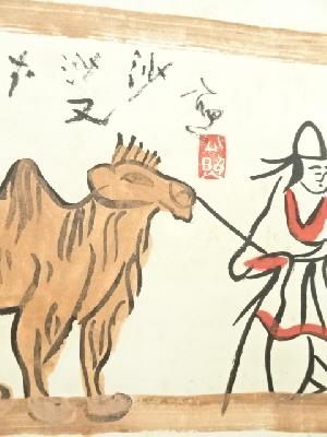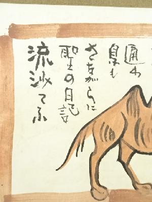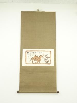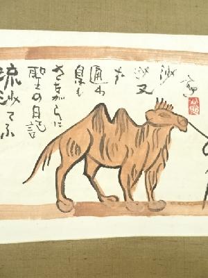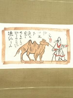東大寺 清水公照筆 「流沙てふ」中国旅画賛 横物 肉筆紙本掛軸(共箱)