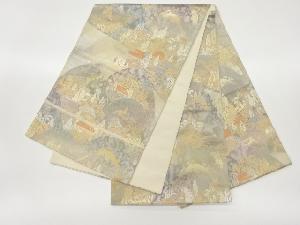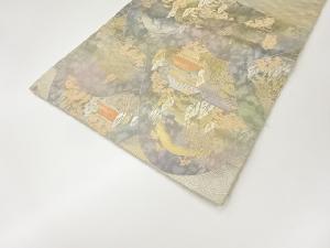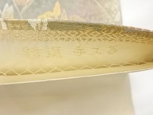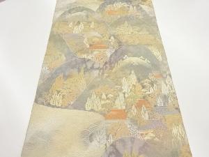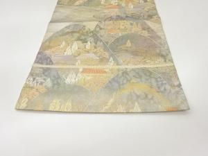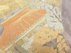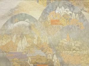 服部織物製 こはく錦引箔山並みに木々・民家模様織出し袋帯