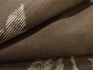 洗練された落ち着きのある色合いで、生地そのものは柔らかく、しわになりにくいと言われている。大島紬の特徴とも言える、織締めと呼ばれる技法で藍を用いて染められた糸を使用している。