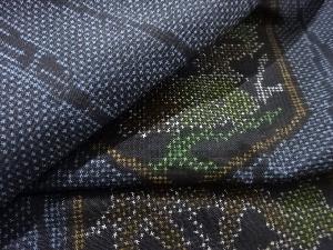 洗練された落ち着きのある色合いで、生地そのものは柔らかく、しわになりにくいと言われている。大島紬の特徴とも言える、織締めと呼ばれる技法で藍を用いて染められた糸を使用している。